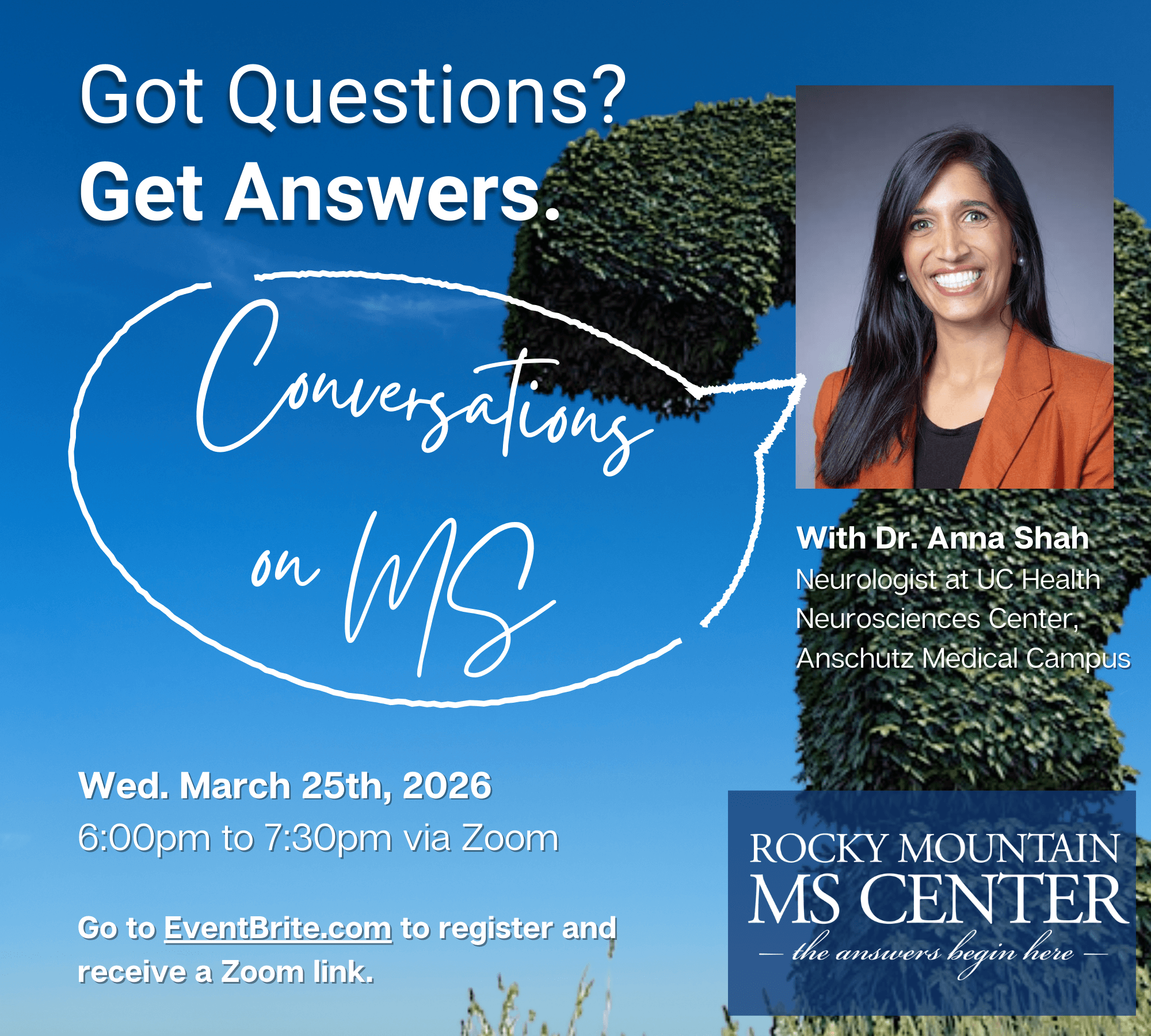 Conversations on MS is an audience-directed conversation facilitated by a rotating slate of top Neurologists and MS Specialists. These free events, offered through the Rocky Mountain MS Center, were originally scheduled 12 to 18 months apart. They quickly became wildly popular, however, and are now scheduled several times a year. Audience members are invited to submit their questions in advance or simply bring them the day of the event. The focus tends to be on the latest trends in diagnosis, intervention and therapy, but you are welcome to ask anything that your regular neurologist never seems to have the time to answer. This month's guest speaker is Dr. Anna Shah, an MS Specialist with the UCHealth Neuroscience Center. This session will be conducted online only, and spots are limited, so you are encouraged to register as early as possible. See the link to register through Eventbrite below, or call the MSA office for assistance.