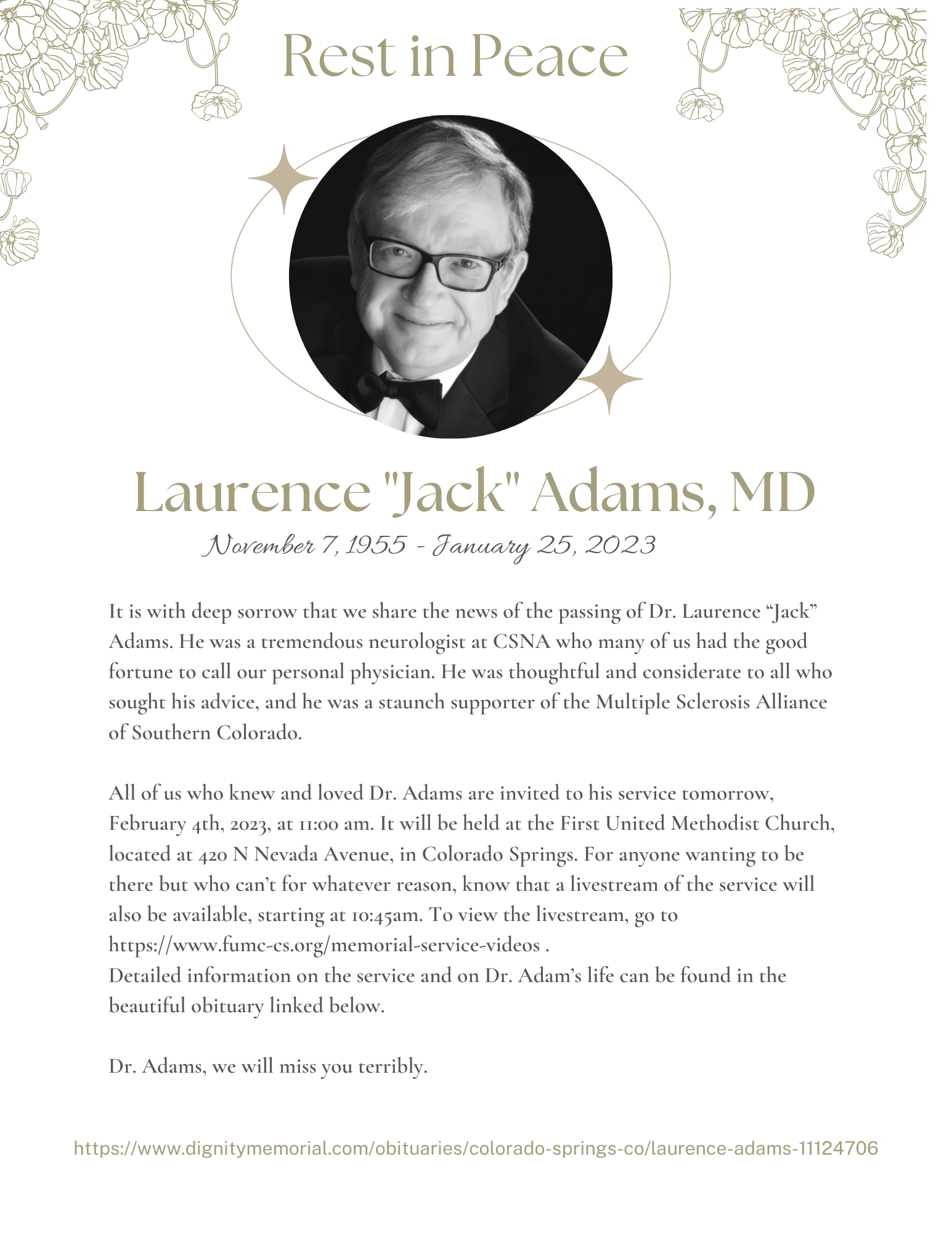 It is with deep sorrow that we share the news of the passing of Dr. Laurence “Jack” Adams. He was a tremendous neurologist at CSNA who many of us had the good fortune to call our personal physician. He was thoughtful and considerate to all who sought his advice, and he was a staunch supporter of the Multiple Sclerosis Alliance of Southern Colorado.