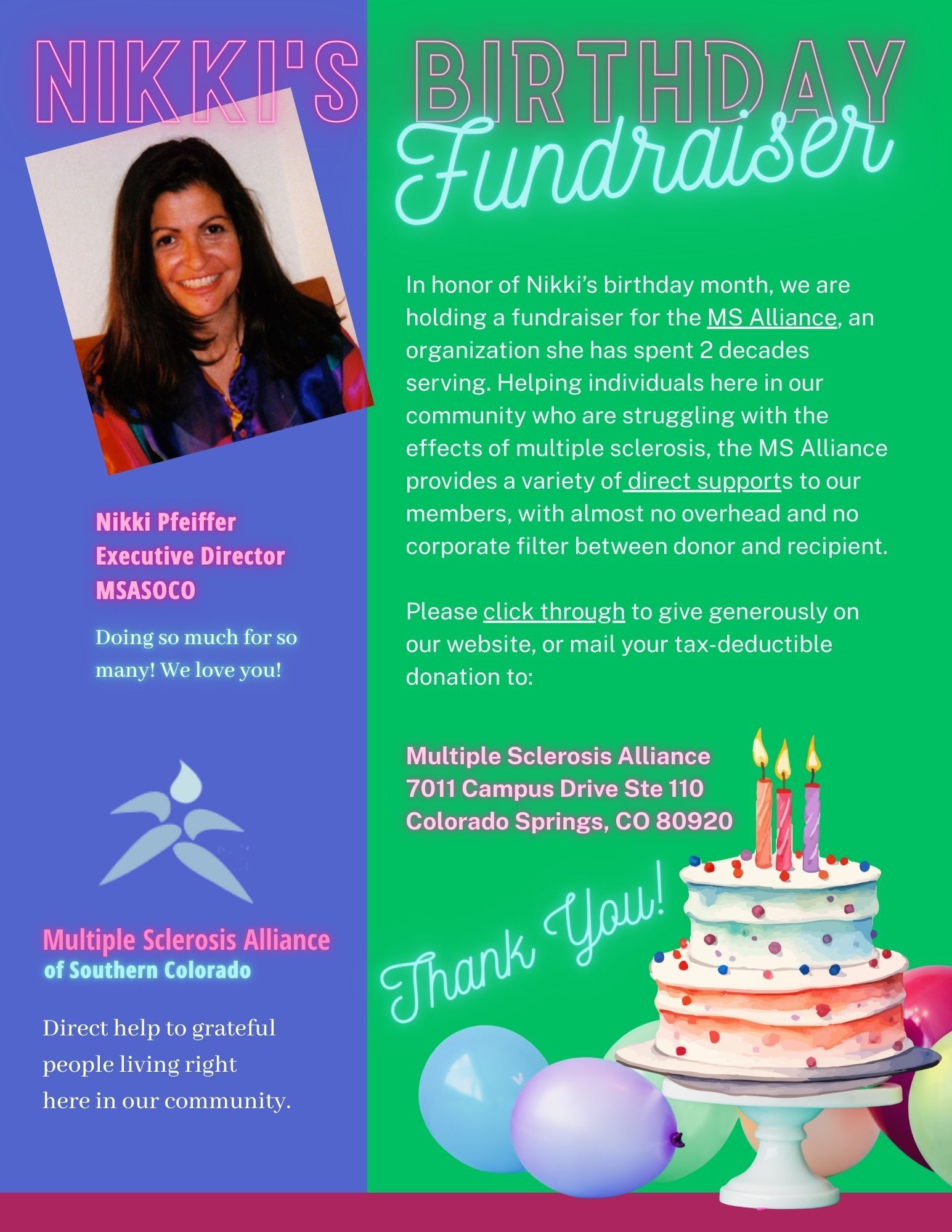 Nikki's birthday is January 15th, but around here, we like to celebrate all month! Her leadership as Executive Director of the MSA over the past two decades has turned this organization into something truly awe-inspiring. Our clients needs are varying and often urgent, and our ability to respond quickly with a human touch is like nothing we've ever seen from a similar organization. We like to trumpet that every January. Our overhead is miniscule, we spend $0 on research, and every dollar we DO spend stays right here in our community. Charitable donations to the MSA offer the greatest return on dollar donated because that dollar directly impacts someone in Southern Colorado who is battling the effects of MS. Thank you so much to all our donors, and thank you, Nikki, for building an organization worthy of our donors. Happy birthday, Nikki Pfeiffer!