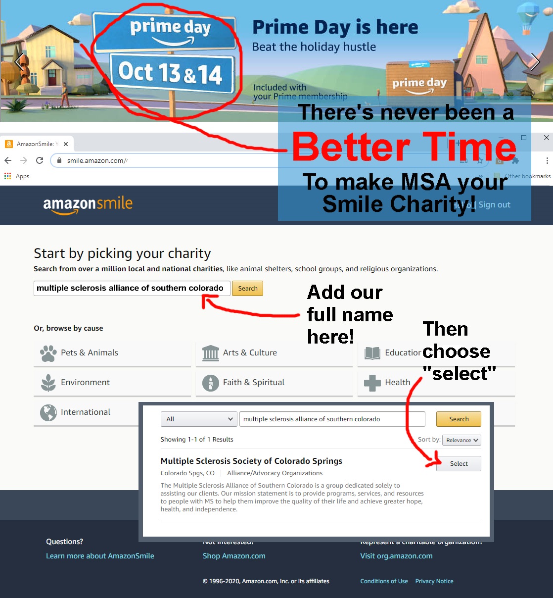 Take advantage of Prime Day and make us your Amazon charity! Go to https://smile.amazon.com. Type in our name in the Charity box. When we come up (as Multiple Sclerosis Society of Colorado Springs) click "select." That's all there is to it. IT COSTS YOU NOTHING and gives MSA a small donation every time you shop. Thank you so much for helping us improve services to our members!